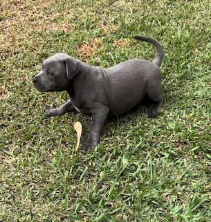 We contacted Janelle at Kloudknine in May about an Blue English Staffie and our journey began. We have had Tarnie with us for four weeks now and she brings us joy every day. Janelle has been excellent at communicating with us throughout our journey from waiting for the pregnancy through to having to arrange transport down to Melbourne due to border closures. We received regular photo and video updates, along with weekly weigh-ins. The puppies are raised in a lovely, caring and nature environment producing friendly, confident and very beautiful dogs. Janelle would FaceTime the group so we could all see our babies in action. I could not recommend Kloudknine more for a pure bred Blue English Staffie. Fiona Joy Oct 7 2020